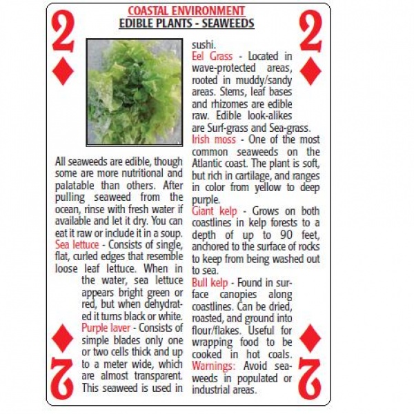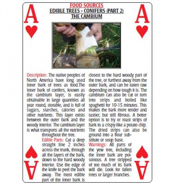 Great way to learn about wild edible plants and a surprising comprehensive (North American based) resource. 52 cards describe a range of edible pants, how to find, process and consume them. Great for camp fire evenings or just general information.