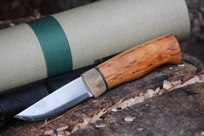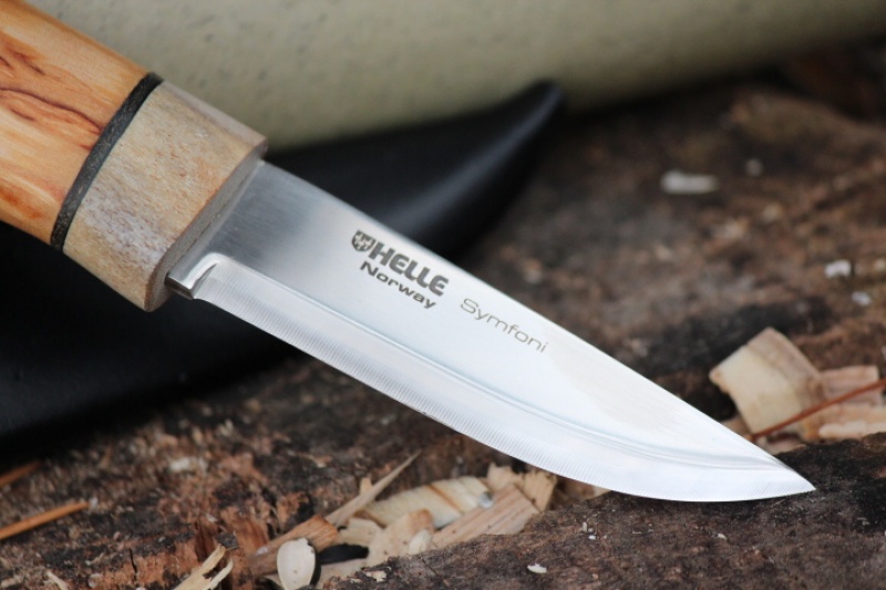 Nice outdoor knife from Helle of Norway, compact and comfortable the knife has a beefy but shorter handle. Great camp knife, food prep or similar. Traditional stick tang construction the handle is birch with stag antler. 2.7mm thick laminate blade is scandi ground, 59HRC, so nice edge holding and easy to sharpen.