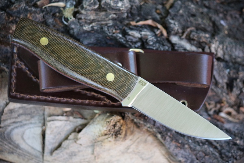 Superb compact outdoors knife from Enzo of Finland. This is a full broad tang construction, using the excellent D2 semi stainless steel, Full flat ground to 60HRC. Great outdoor knife, comfortable grip with sculpted wide belly in Green Canvas Micarta and Red liners Full broad tang and great blade length for a wide range of chores. 3.0mm spine means strength and a great slicer for the camp, hunting or Bushcraft. The knife comes with a good quality pouch style sheath with can be worn high or low.