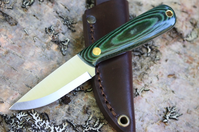 Green Micarta handle, brass pins, full broad tang with brass lanyard hole. Scandi grind, 12C27 stainless steel, 58HRC.