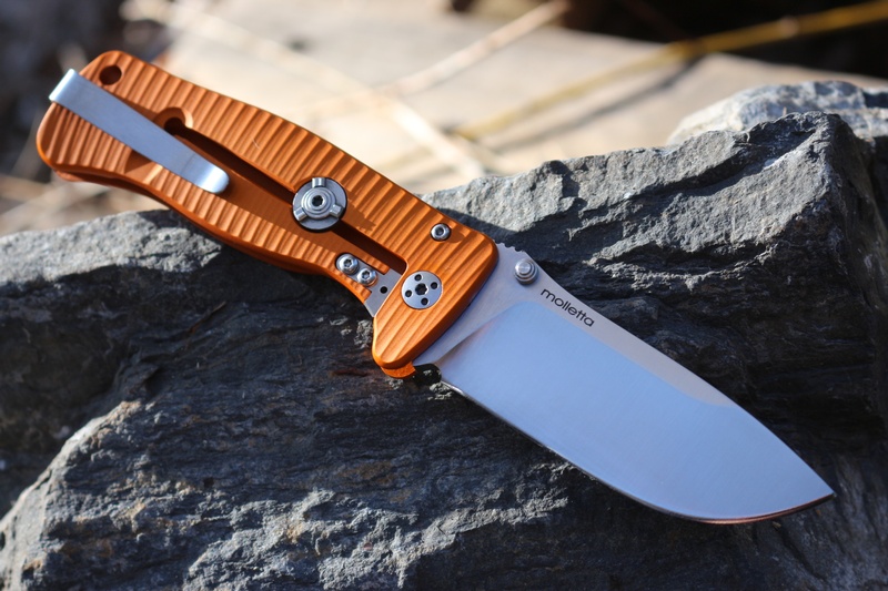 Aluminium monolithic frame lock, Orange handle with satin Blade