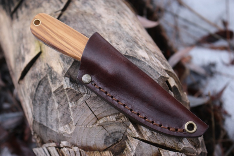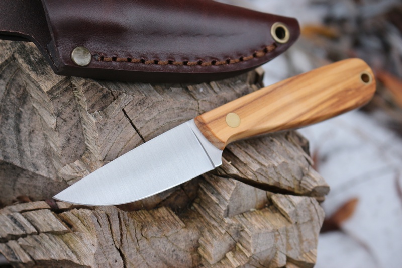 Olivewood handle, brass pins, full broad tang with brass lanyard hole. Flat grind, 12C27 stainless steel, 58HRC.