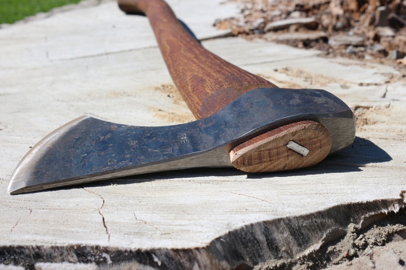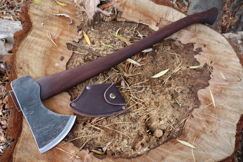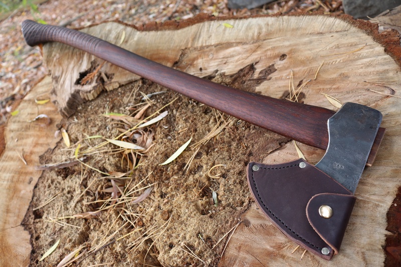 Wood and steel wedge head, nice single bevel (slight convex) and comes with leather head cover. Both handle and Leather cover are made by a local Amish community.