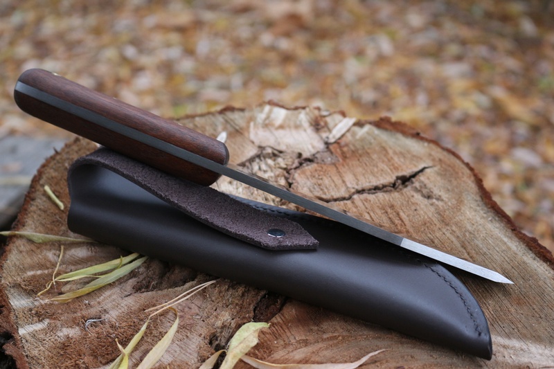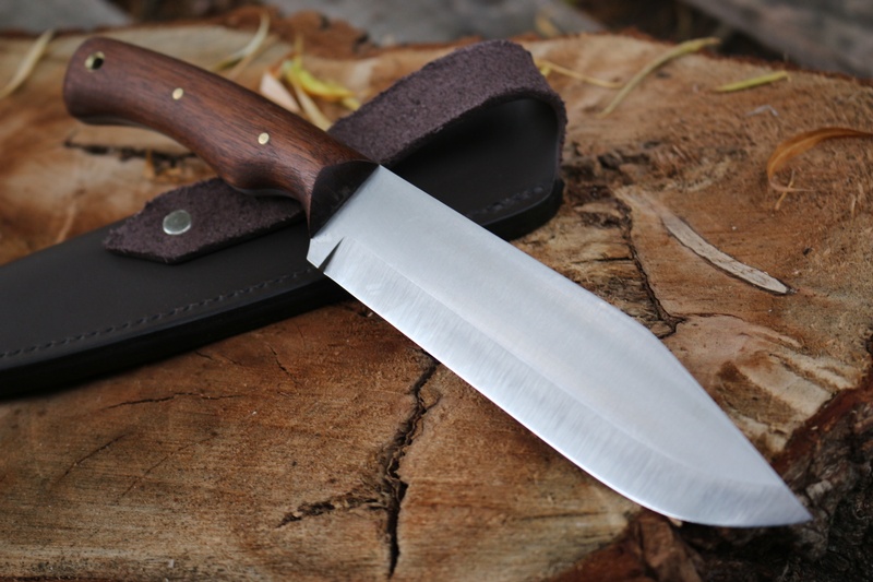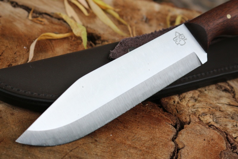 Strong 1095 steel blade, zero scandi ground for a tough edge and ease of sharpening, the knife is full broad tang with brass pins and hardwood slabs. The spine is 3/16ths with a 90deg square and the slabs are well contoured for a sure grip.