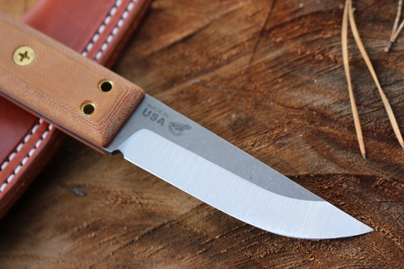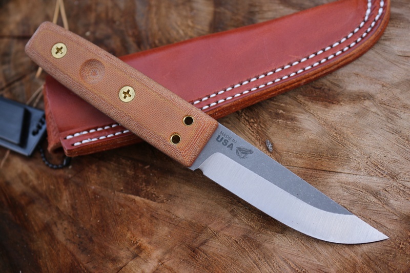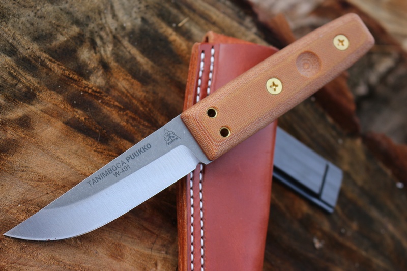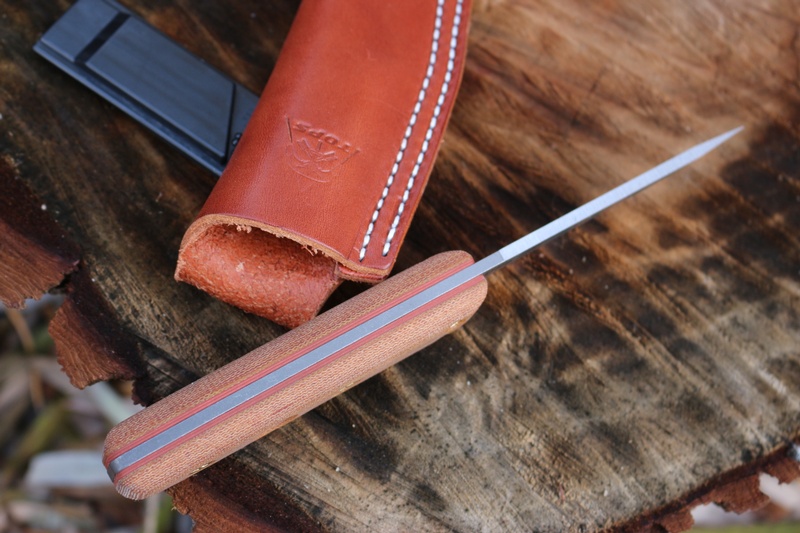 The Tanimbooa strengthens the design with a full broad tang, but keeps to the origin of less is more. The steel is the classic Tops 1095, scandi ground with a very fine secondary bevel, the slabs are Matte Micarta. Overall a great, traditional Bushcraft Knife.
