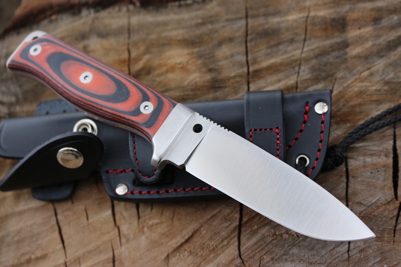 The removeable slabs are Red and Black micarta, the tang is extended to provide a lanyard hole, stainless bolsters as well make for a very sturdy outdoor knife.