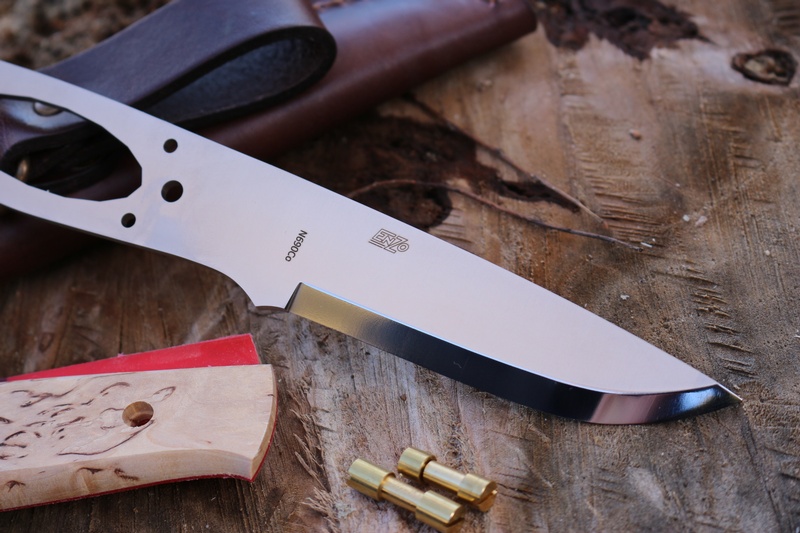 Everything you need to make up this exceptional Bushcraft knife, the full broad tang blade blank (N690 steel, scandi ground, 59HRC), two precut Curly Birch slabs with Red liners, x2 brass corby rivets to secure the slabs and the sheath as well.