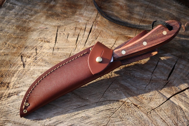 Full broad tang with soild pins and Rosewood slabs, the 3.75mm thick blade is of German C70 High Carbon Steel, 58HRC. The robust spine is jimped and the blade is an upswept drop point.
