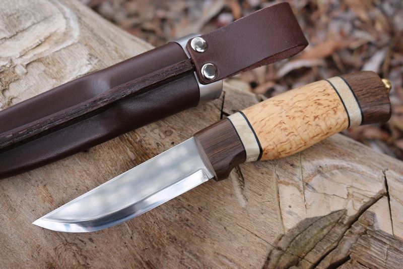 The handle is a deep bellied Oak, Stag with Curly Birch with a stick tang and a brass ferrule. The knife is a quality piece of kit, a great camp knife and hiking companion.