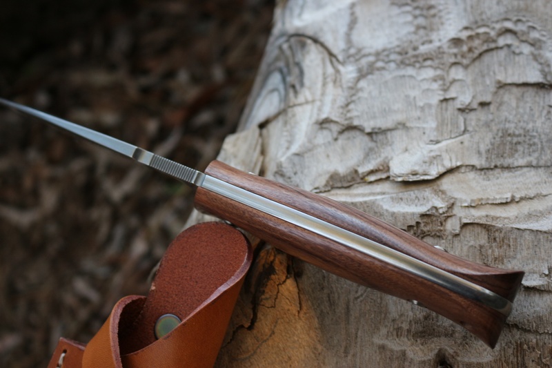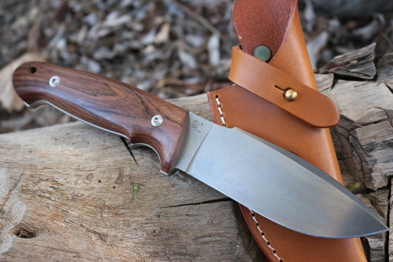 The Hardwood handle is very well sculpted and gives excellent grip and the full broad tang construction makes a very stong knife.