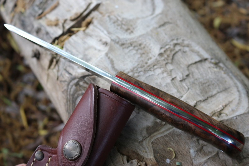 The 4mm full broad tang knife is strong and robustly made, with Walnut slabs and Red Liners, solid stainless allen head screws and stainless lanyard hole. Its a great blade length for control being 4 1/4in and the Bohler N695 steel provides really excellent toughness and very good edge holding (60 HRC).