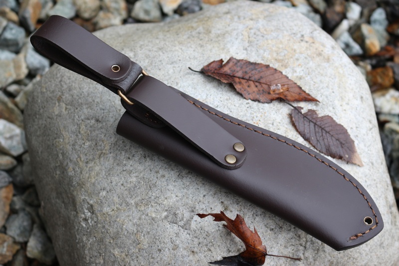 Quality leather sheath for Enzo's Nessmuk. Nice thick leather with HD stitching, metal rivets and dandler option.
