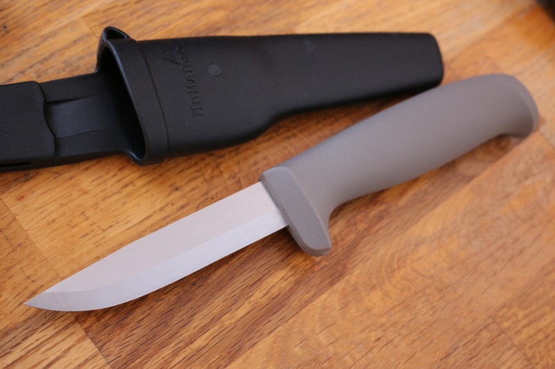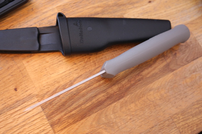 Plumber´s knife featuring a file that can be used to remove burrs. The blade is made from German knife steel, 2.5 mm stainless steel that has been hardened to 57–59 HRC.