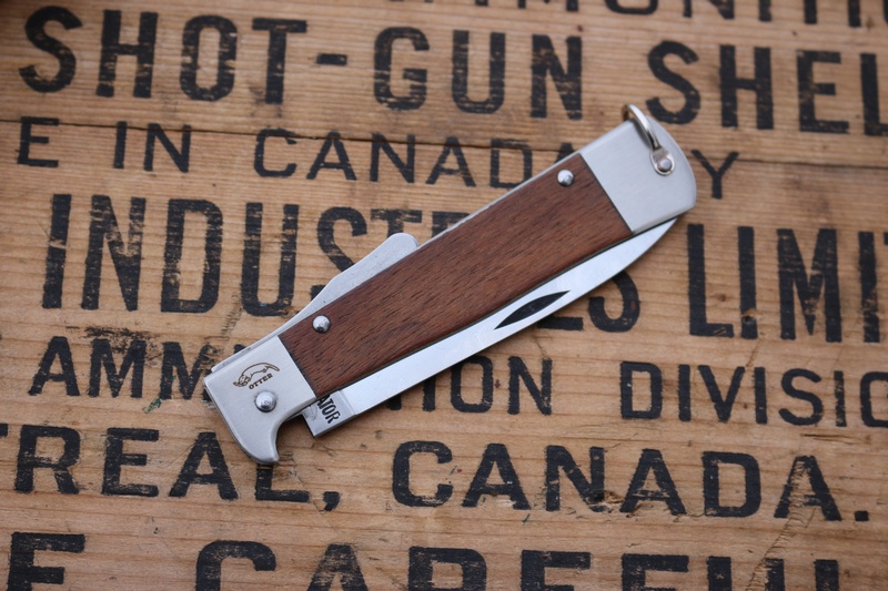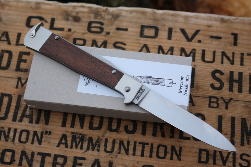 Solid and reliable, these knives are Steel handle with Walnut insert, Carbon German Steel C75 blade with a chunky backlock.