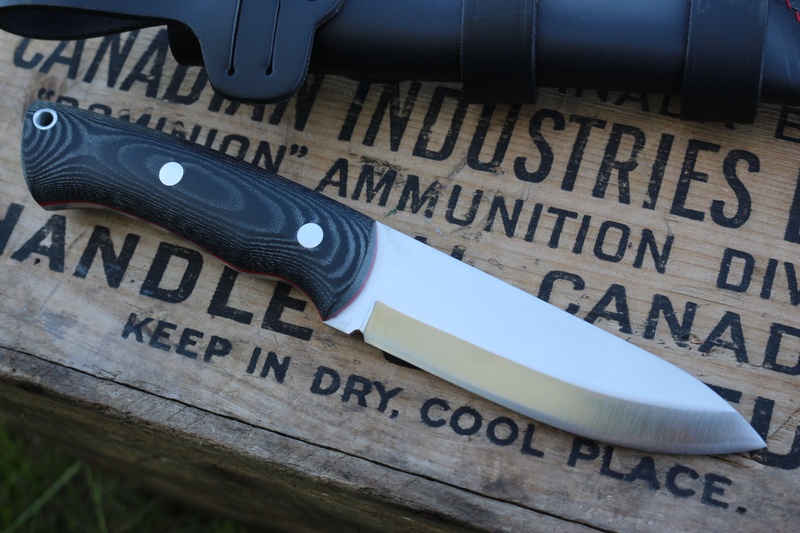 The knife has solid Micarta slabs with Red Liners and the ergonomic handle is comfortable and great for different hand postions. The Blade is a classic upswept drop point with choil and tapered tip.