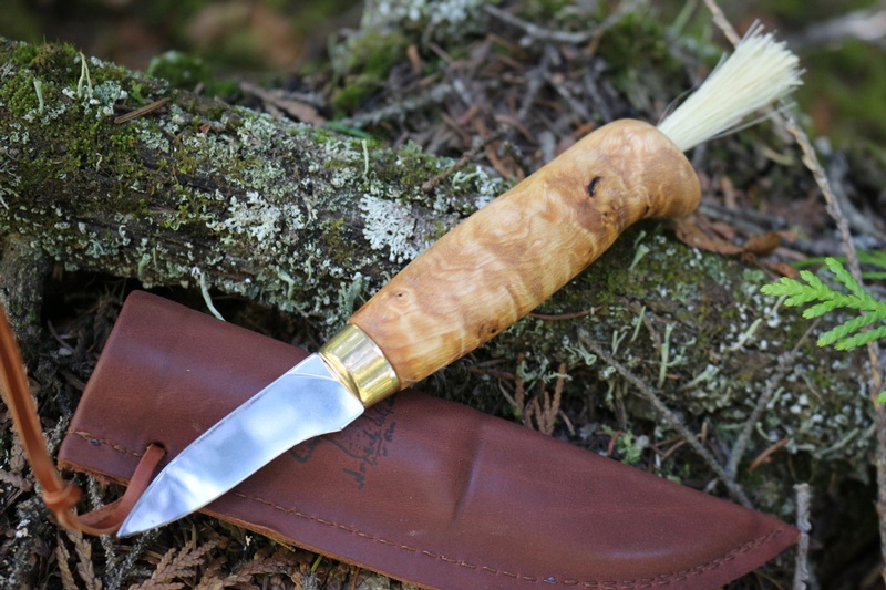 Excellent Finnish made knife, designed specifically for use while collecting Mushrooms. The compact knife has a comfortable traditonally shaped handle, made from Curly Birch (sourced from Finland) with a Brass ferrule.