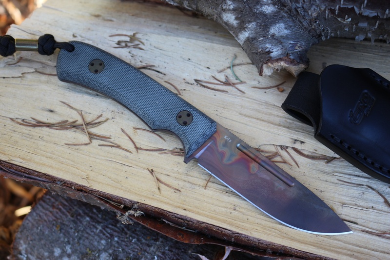 Using the super Steel RWL 34, this knife is a great all around Bushcraft and Outdoorsman's knife, flat ground (with fine bevel) full broad tang (with the raised, capped spine) deep finger choil and solid (textured) Black G10 Slabs.