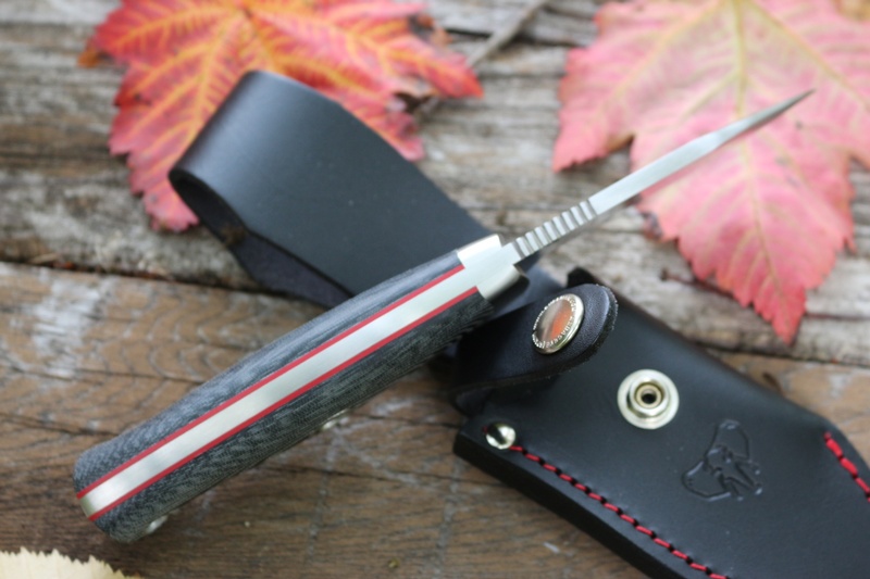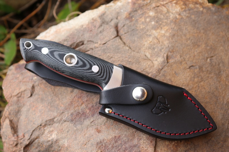 The handle is ergonomic with wide micarta slabs and solid pins and accomodates a lanyard hole and solid finger guard. The blade is a bellied drop point, great for a variety of applications.