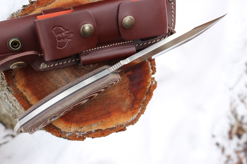 The extra 6 uses the same blade shape and excellent Bohler N695 steel of the original knives, but with an upgraded full grain leather sheath which allows for firesteel carry and sharpener carry too. (Sheath and Sharpener included).