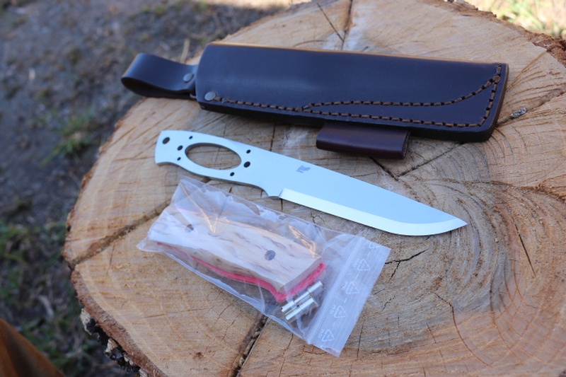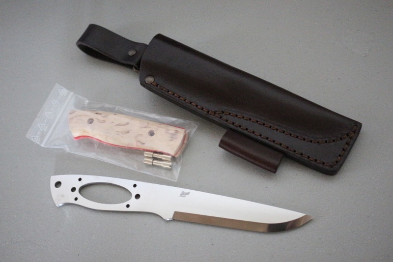 All you need to make one of the best bushcraft knives around....An Enzo Trapper 115 Blade blank in Elmax Steel (scandi ground), Curly Birch Slabs with red liners, Corby bolts and a full Bushcraft Leather Sheath with Firesteeloop.