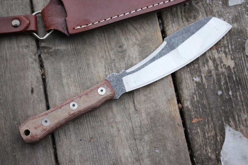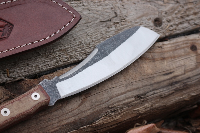 The Sheeps Foot Blade is controllable and a great slicer. This would be a very good Bushcraft Knife. Full Broad tang with 3 pins and Blade is part tumble finish.