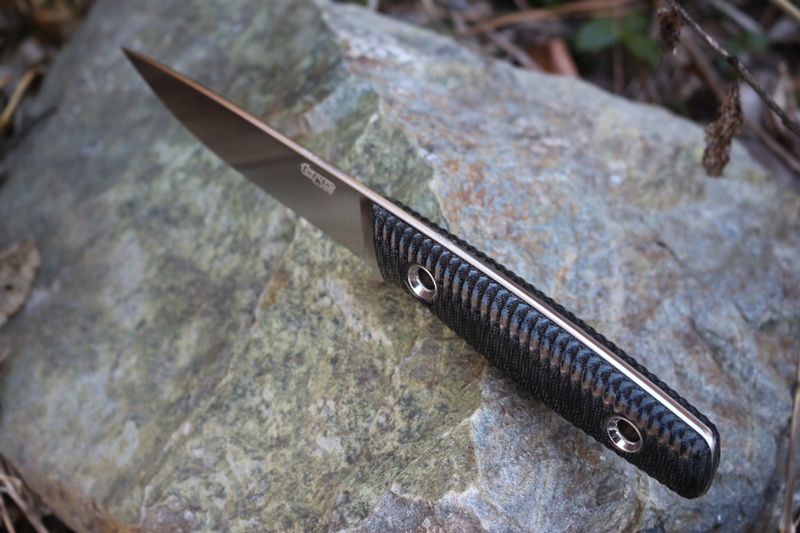 The slim knife is balanced and comfortable in the hand, thanks to the excellent design work, and the fit and finish are meticulous. Full broad tang for strength with Stainless Hollow Pins, the ribbed Natural Canvas Slabs add to the sense of durability and sure grip.