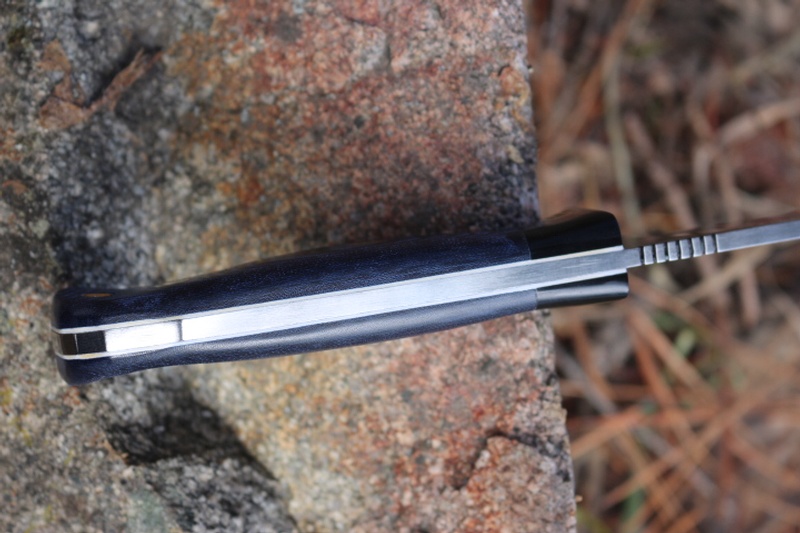 The handle is a Blend of Blue/Black micarta and is what gives the knife its name.