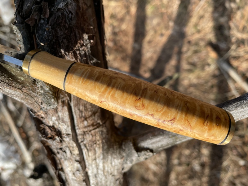 Curly birch handle with birch inlay.
