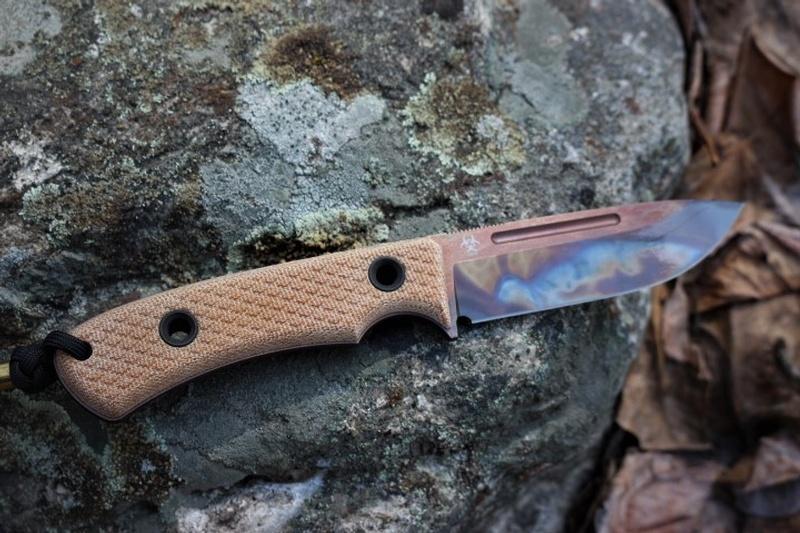 Using the super Elmax steel, this knife is a great all around Bushcraft and Outdoorsman's knife, full flat ground (with fine bevel) full broad tang (with the raised, capped spine) deep finger choil and solid (textured) Canvas Micarta Slabs.