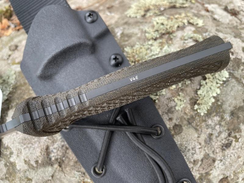 Textured Green Canvas Handle, the knife has superb ergonomics and superior grip. The Jimped and DLC coated blade is made from Vanadis 4E a 'Superclean' Tool Steel with quite exceptional Strength, Wear and Chip Resistance not to mention its stellar Edge Holding, its one of the best Steels currently available and one of the best choices for an Outdoor Knife.