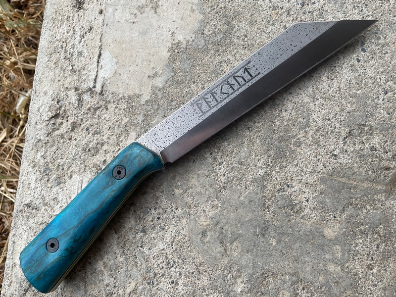 A Modern take on a classic Viking and Anglo Saxon knife, Made from the excellent Swedish Sleipner steel. This particular model is the full broad tang version with a Stabilized Curly Birch Handle in Blue & steel pins. An excellent choice if you're looking for something as functional and tough as a modern knife, but with that old world design & look.