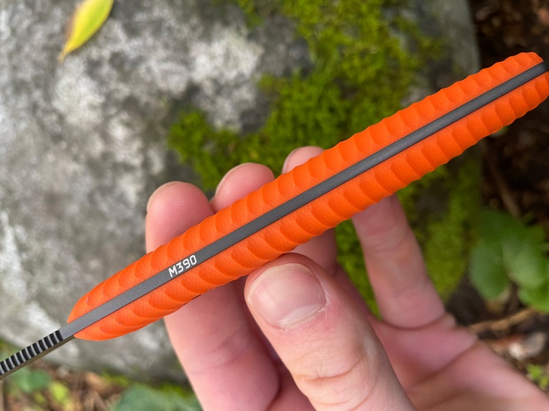 Its Classically outlined Drop Point blade is highly versitile and lends itself to a variety of tasks, the ribbed handle gives great Grip and the Sabre ground Blade of M390 backs up that grip with top end Cutting performance.