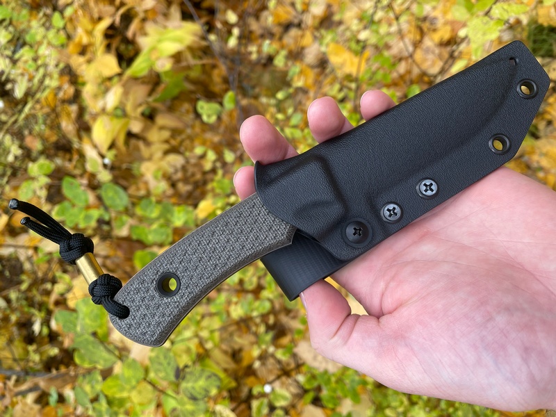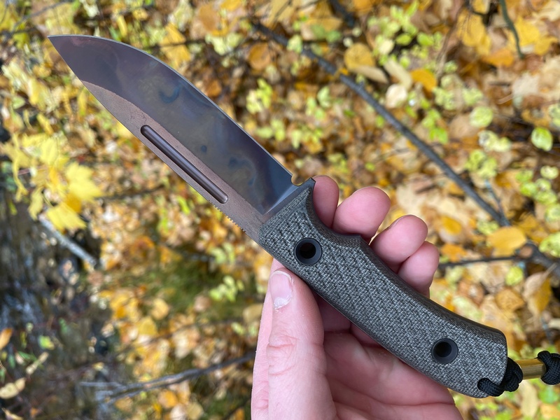 Using the super Elmax steel, this knife is a great all around Bushcraft and Outdoorsman's knife, full flat ground (with fine bevel) full broad tang (with the raised, capped spine) deep finger choil and solid (textured) Canvas Micarta Slabs.