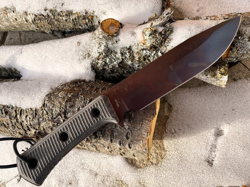 The Sabre ground 6.5in blade is 60HRC and gives tremendous bite, the balance and handling of the knife is excellent and the textured solid Micarta slabs are tough and grippy. Typically seen on smaller knives, ELMAX is an outstanding steel in terms of strength, edge holding and corrosion resistance, its one of the best choices for an outdoor knife and in the Apocalypse you have a lot of it!.