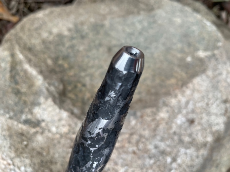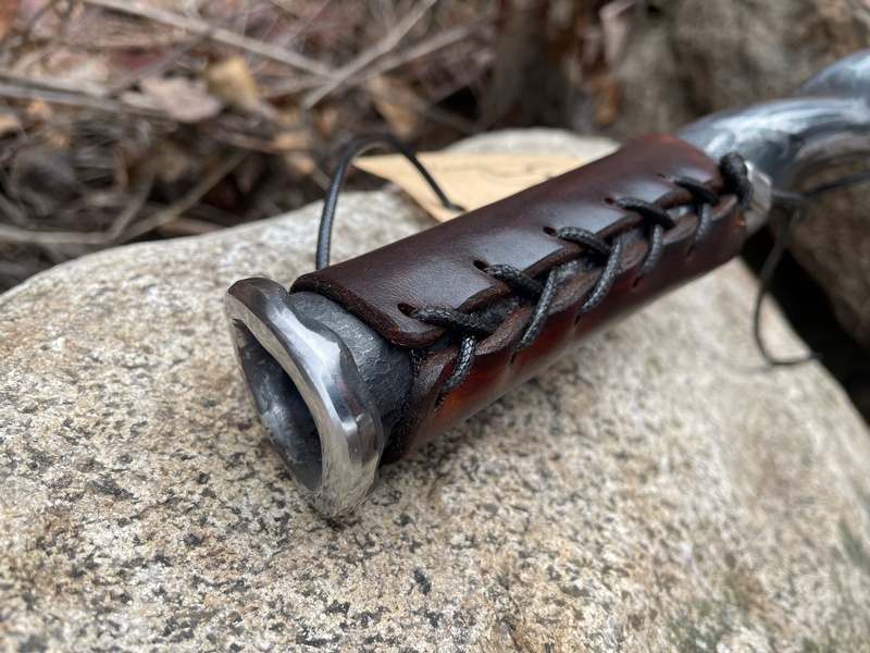 Hand forged from 1 inch heavy black pipe, 20 inches long with double flared mirror polished mouth piece and distal tapered tip. Solid piece used as fireplace poker AND has blow hole to start or rekindle fire. Target specific area to blow oxygen direct into your fire, for easy lighting. Baseball stitched leather handle with riveted leather loop to hang out of the way. This practical piece weighs about 2 lbs and would be a beautiful addition to your fireplace or woodstove. Great for camping also.