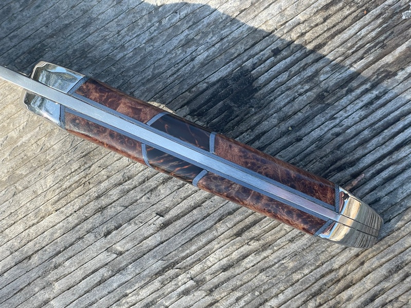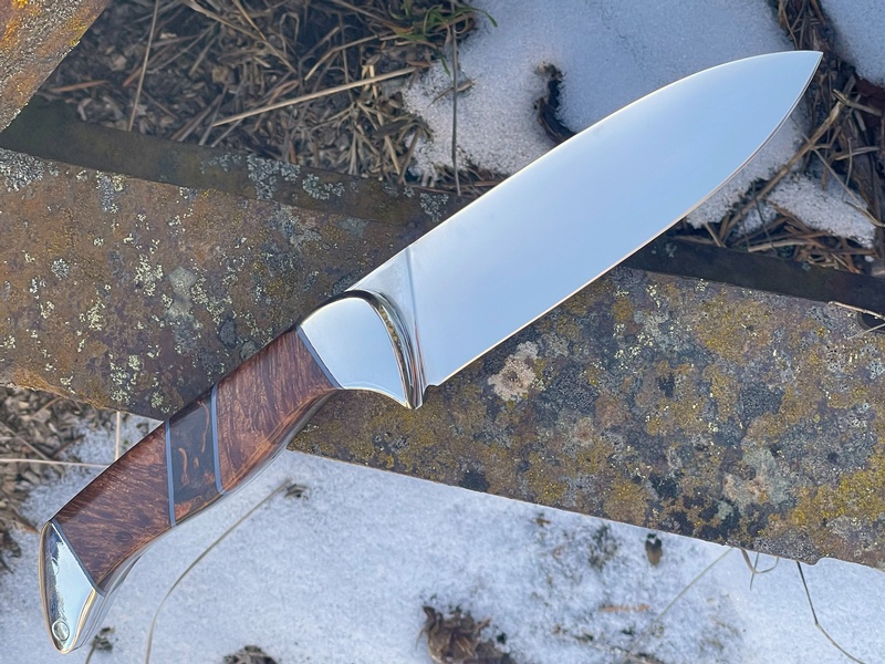 Samuel B Dallaire Camping Knife Magnacut (Myrtle Burl handle with Karelian Inlay)