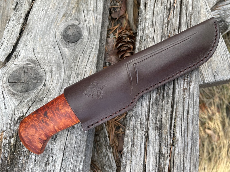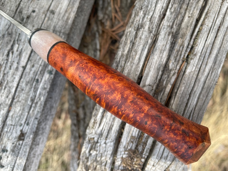 Stick Tang to keep the weight down, the handle fully encloses the Tang with its body of Dyed Curly Birch and Reindeer Antler, capped with a Stainless Ferrule.
