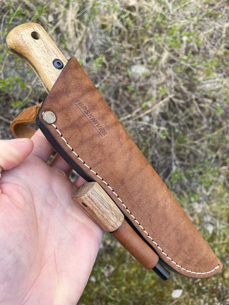 This B1 has the traditional Spear point Blade shape so loved by Bushcrafters and the neat Scandi grind makes this easy to Field Sharpen. The removeable Walnut Slabs are well shaped and are held with two Hex Screws, the end is drilled for a Lanyard.