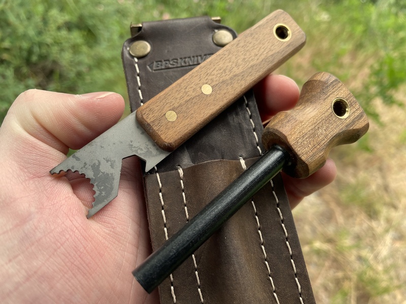 It includes a functional leather belt pouch for both the ferro rod and scraper which can attach to your belt for added convinece! The leather is of good quality and the stitching is nicely done, a very practical addition!