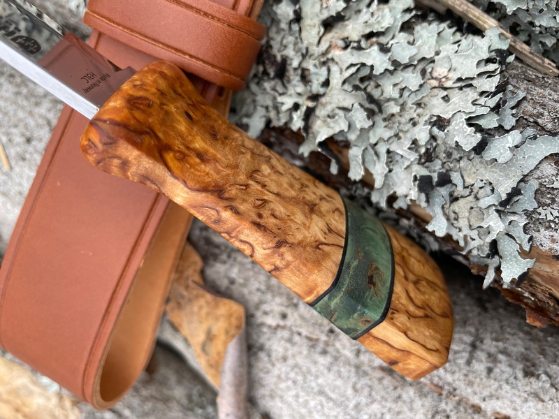 The handle, too, has been reimagined. While the original was crafted from a single piece of birch, the 50th anniversary version showcases a striking composite handle made from curly birch, stabilized green curly birch, and leather. That signature Helle-green hue in the handle is more than just eye-catching—it’s a tribute to both the legacy of the design and the brand’s continued pursuit of innovation.