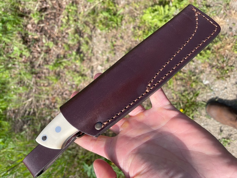 This Trapper is in the ELMAX Steel (60-62 HRC) zero scani grind, comes with leather scandi style dangler sheath.