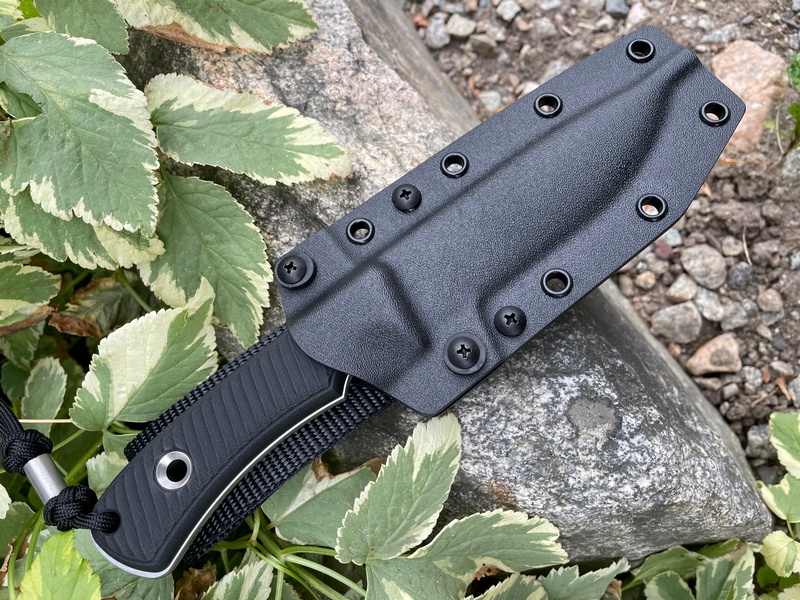 The double black micarta handle gives you great traction when in use thanks to its nice texturing and ergonomic shape, and it looks great too! A really high end Bushcraft knife. It comes with a very nice ambidextrous kydex sheath.