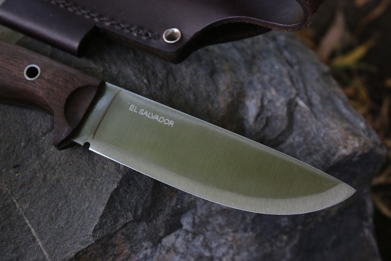 Excellent Joe Flowers designed outdoor knife, nicely contoured Walnut slabs, hollow pins with thumb indents on the fingerguards. Full broad tang (3mm tapering to the tip), 1075 High carbon Steel, 55HRC, single bevel grind. Overall an excellent camp or bushcraft knife.