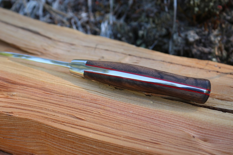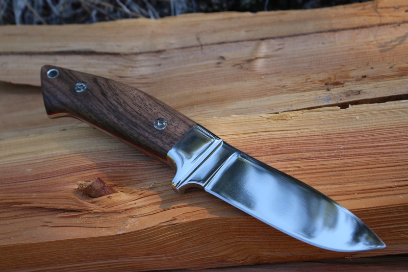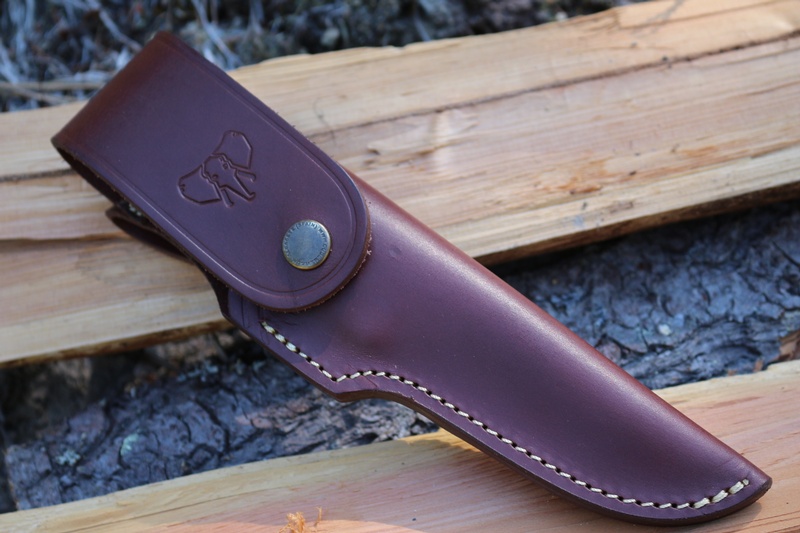 Sculpted slabs in Walnut, Red liners and a full broad tang, give the knife a great grip and solid feel. The 4in blade is N690 steel, a tough and hard stainless (60 HRC) well up to the rigors of wilderness hunting. Combined with a great blade shape (thats not just for field dressing but for general camp and Bushcraft as well) the knife lives ups to its tough living namesake.