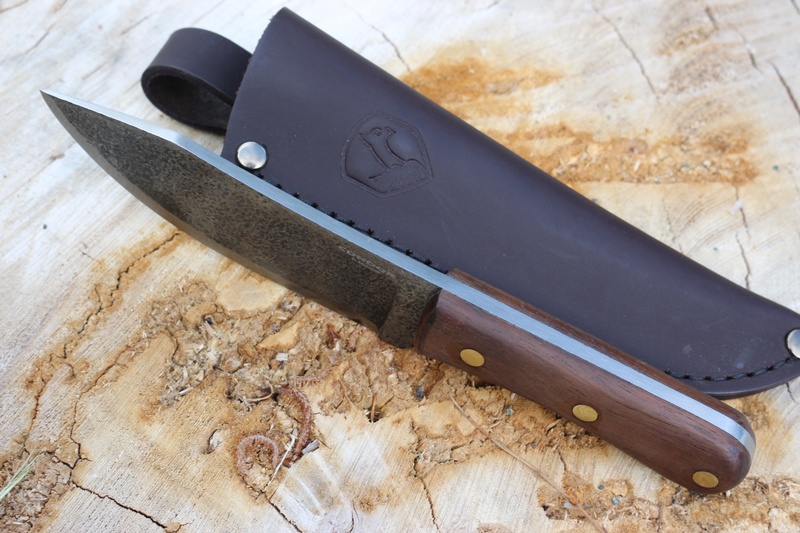 Full broad tang with brass pins and Walnut slabs, the knife is solid and well made. It uses the same 10785 High Carbon Steel of the original and is scandi ground.