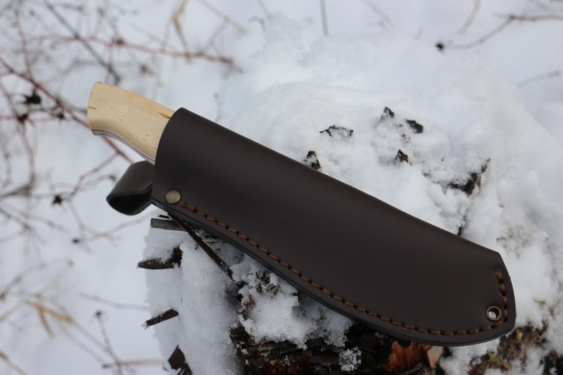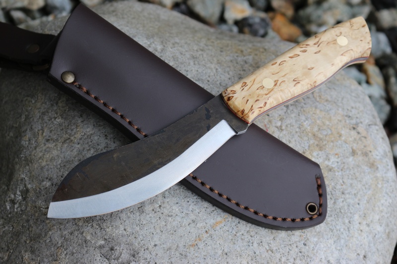 The knife utilizes the Trapper handle for comfort, full broad tang and solid pins for strength (4mm stock, spine is square) and has that superb upswept blade thats allows for so many applications in the Outdoors. Feild dressing, woodwork, food prep, fire prep and many more