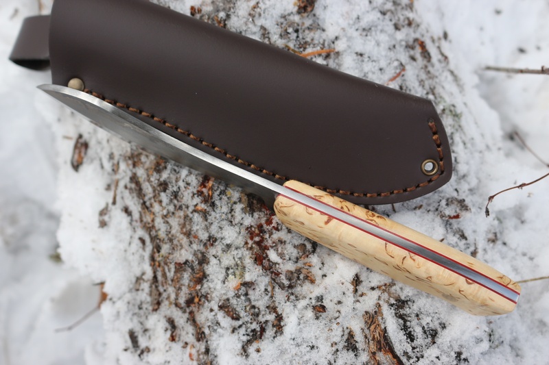 80CRV2 HC steel is very tough, has a fine edge and is scandi ground for ease of use, the Spine is square cut and the slabs are Curly Birch with with red liners and Brass Pins.