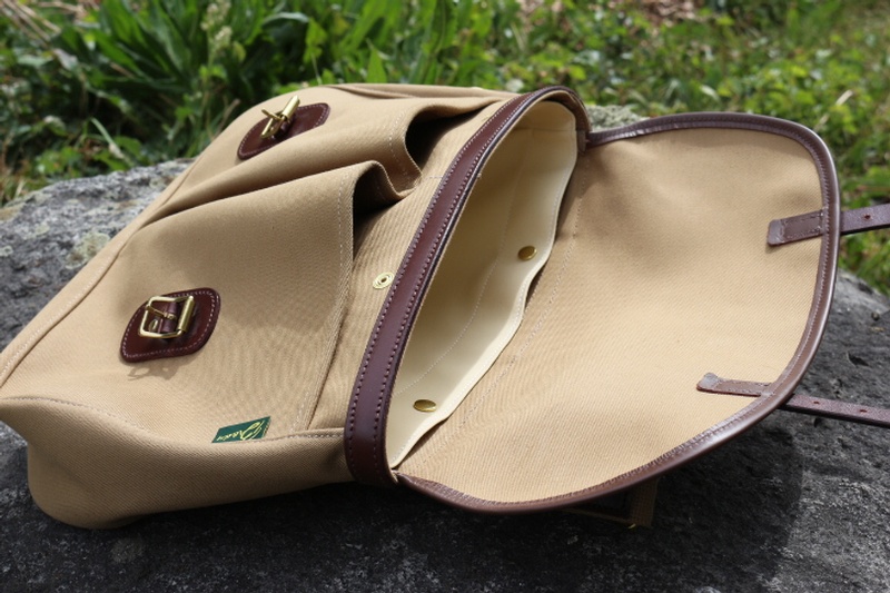The Dart Bag with Liner in Kharki Canvas with Bridle Leather Trim and Brass Fittings. The Dart is named after the Famous Trout River of Devon, England.