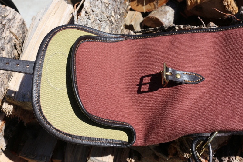 The Classic English Shotgun Cover, Canvas with Bridle Leather Trim and Brass Fittings. The Slip has an 'Action Patch' in Leather to help protect the action of the firearm and a reinforced end.