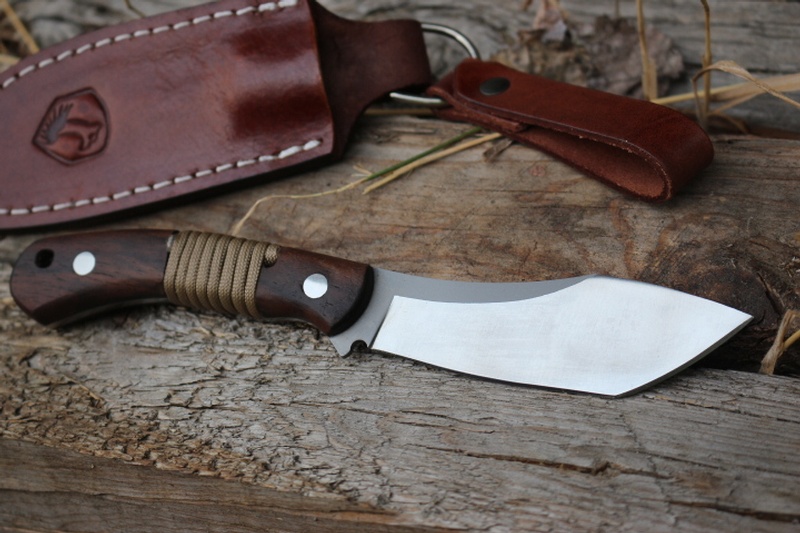 The Knife is Full Broad Tang with Walnut Slabs that are machined with a gap for Paracord wrap and two Stainless Pins.